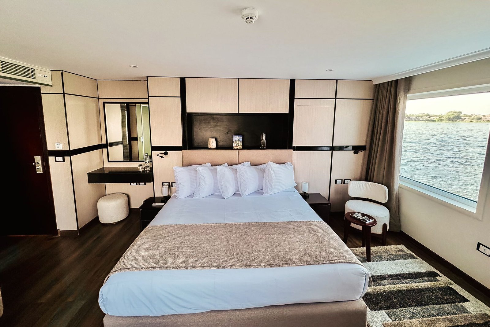 Our Nile River cabins with stunning views offer an unparalleled immersion into the beauty and history of ancient Egypt. Our cabins provide an immersive and unforgettable experience. Each cabin is designed for comfort and relaxation, featuring large panoramic windows, Prepare to be captivated by the beauty of Egypt, all from the comfort and privacy of your own floating haven.